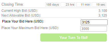 For example, let's say the next allowable bid is $3,125, but you would like to bid $5,125 to psych out other bidders. By typing in $5125 in the same "Place Your Bid Here" field and clicking the "Your Turn To Bid" button, your bid will be automatically advanced to $5125, instead of the $3125.
