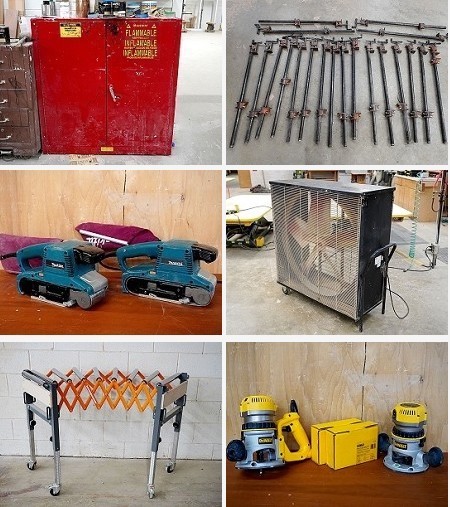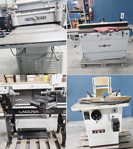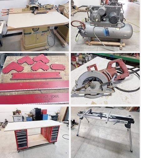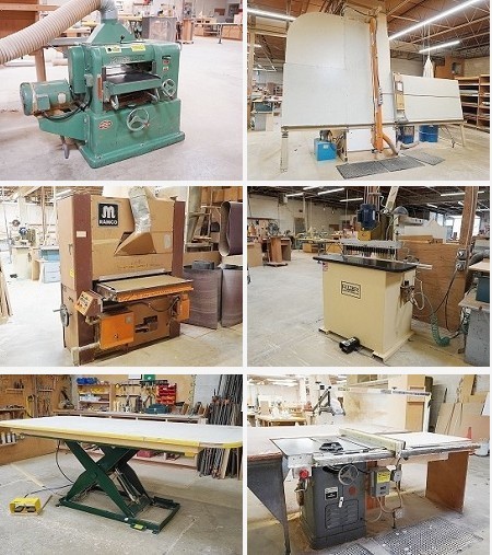 Auction includes: Scissor Lifts - Borers - Table Saws - Planers - Dust Collection - Finishing Equipment - Shapers - Clamps - Wide Belt Sanders - Panel Saws - Portable Tools - Bandsaws - Radial Arm Saws - Miter Saws - Drill Presses - Pinch Rollers - Feeders - Edge Sanders - Spindle Sanders - Ladders - Material Handling - Conveyors - Routers - Fans - Appliances