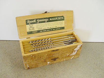 Lot #192 - Antique Stanley Russell Jennings Screw Rip Auger Bit Set In Wood Finger Jointed Box
