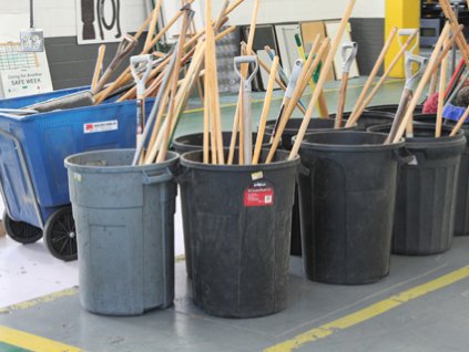 Lot #458 - Trash Cans, Brooms, Shovels, Mops and Rolling Trash Hopper