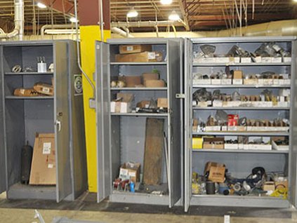 Lot #6354 - Steel Storage Cabinets with Lantech, Alvey, Robot and Carton Sealing Machine Parts