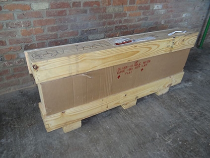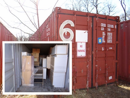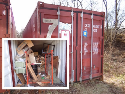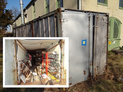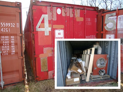 Lot #577 - Shipping Container & Contents - Racks, Edgebanding, Light Fixtures, Etc