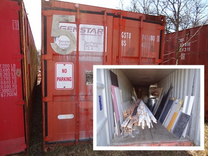 Lot #575 - Shipping Container & Contents - Duct Work, Countertop Material, Doors, Etc