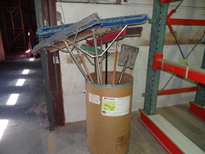 Lot #587 - Barrel, Brooms & Shovel