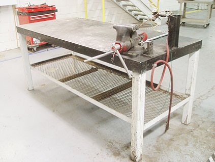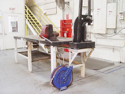 Lot #2736 - Welding Table, Arbor Press, Vise and Hose Reel