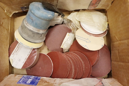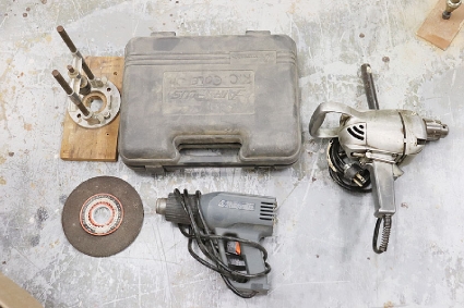 Lot #326 - Box of Misc. Tools (Drill, Horse Shoes, Heat Gun, Grinding Wheels, etc.)