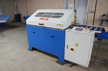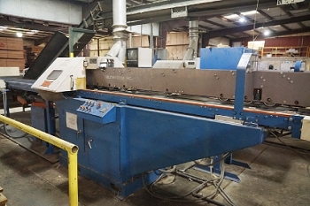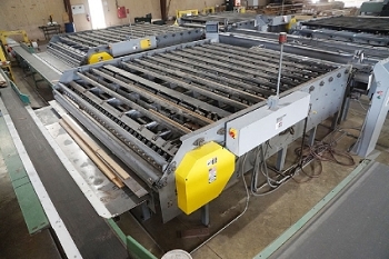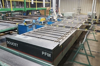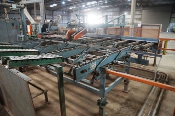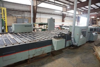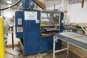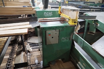 Includes: Doucet PFM Solid Plank Flooring Feed Through End Matcher (2006) – Roach Rubber Belted Sorting Conveyors Table – (4) Precision Products 13-M Upcut Chop Saws - (3) Roach Conveyor Tables and Strapak Automatic Strapping Machines
