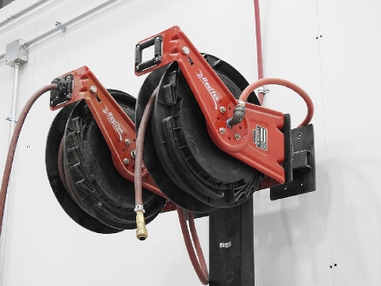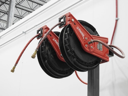Lot #136 - Reelcraft Spring-Loaded Air Hose Reels w/ Hose (Qty 2) Mounted on Steel Post