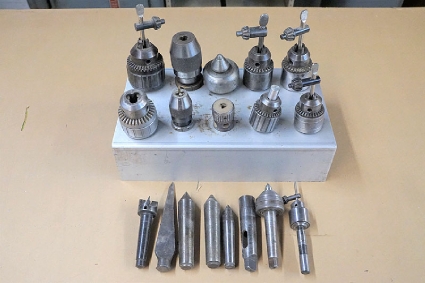 Lot #74 - Lathe Centers, Drill Chucks and Storage Rack