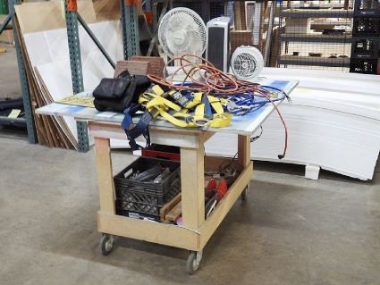 Lot #373 - Rolling Cart with Contents (Chalk, Fan, Heaters, Air Hose, Extension Cord, Safety Harness, Etc.)
