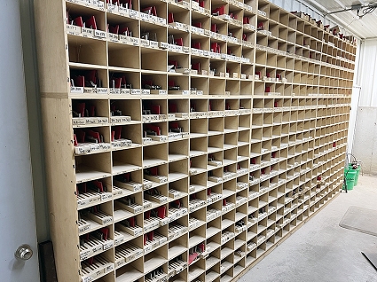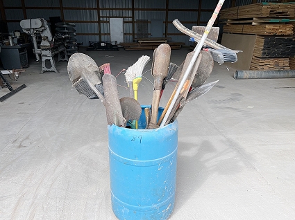 Lot #89 - Barrel of Brooms, Shovels and Misc Hand Tools