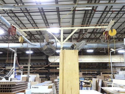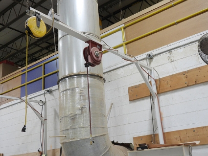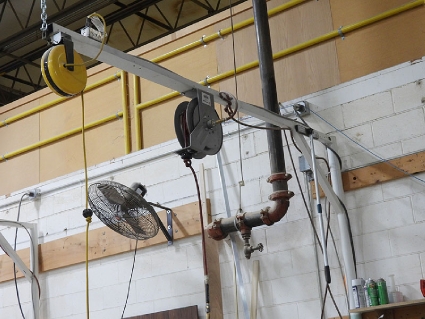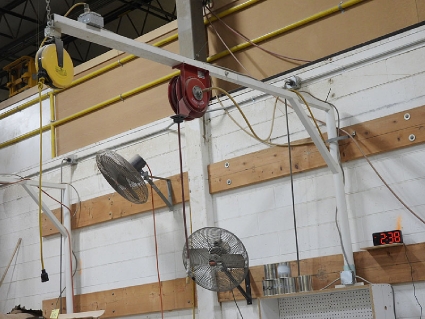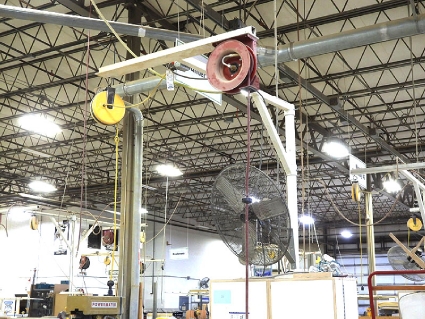 Lot #59 - Steel Post and Bridge with Mounted Spring-Loaded Air Hose and Electrical Reels and Fans