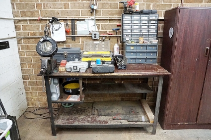 Lot #183 - Shop Steel Frame Work Table With Vise And Tools/Supplies