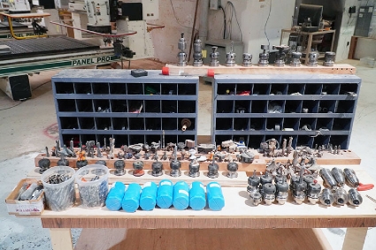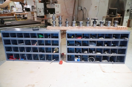 Lot #64F - HSK63F Tool Holders and (2) Metal Cabinets w/ Assortment of Router Bits, Drill Bits, Collets, Collars and other CNC Tooling Supplies