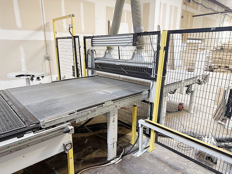 Gantry equipped with (2) vacuum suction cups and pneumatic pusher arm for loading panels on worktable and the transferring workpieces to outfeed table.