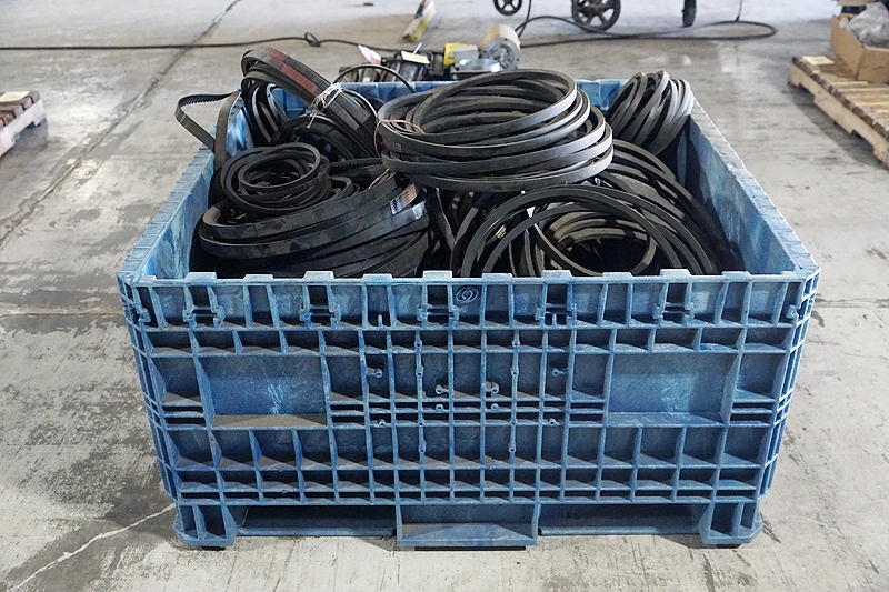 Lot #205 - COMMERCIAL PLASTIC CRATE WITH MACHINE DRIVE BELT INVENTORY (UNUSED)