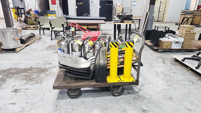 Lot #547 - STAINLESS STEEL FIRE EXTINGUISHERS, SHOVELS, CART & STEEL BOLLARDS