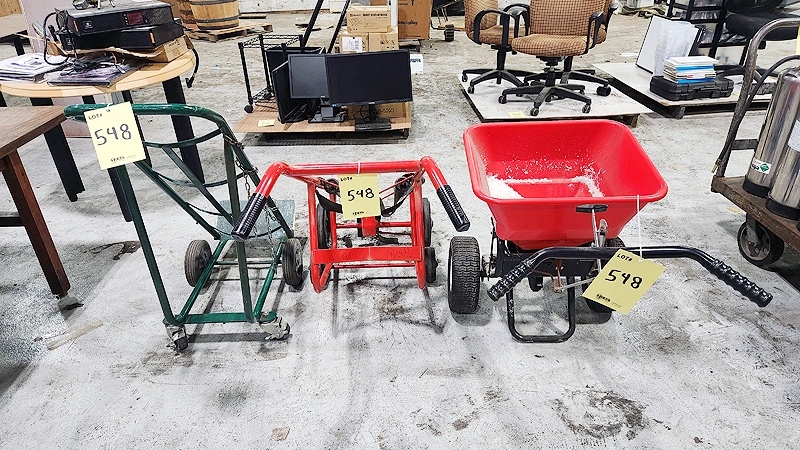 Lot #548 - BROADCAST SPREADER, HEAVY-DUTY CYLINDER CART & STEEL HAND TRUCK/DOLLY